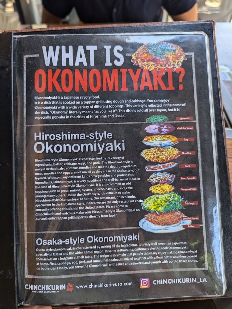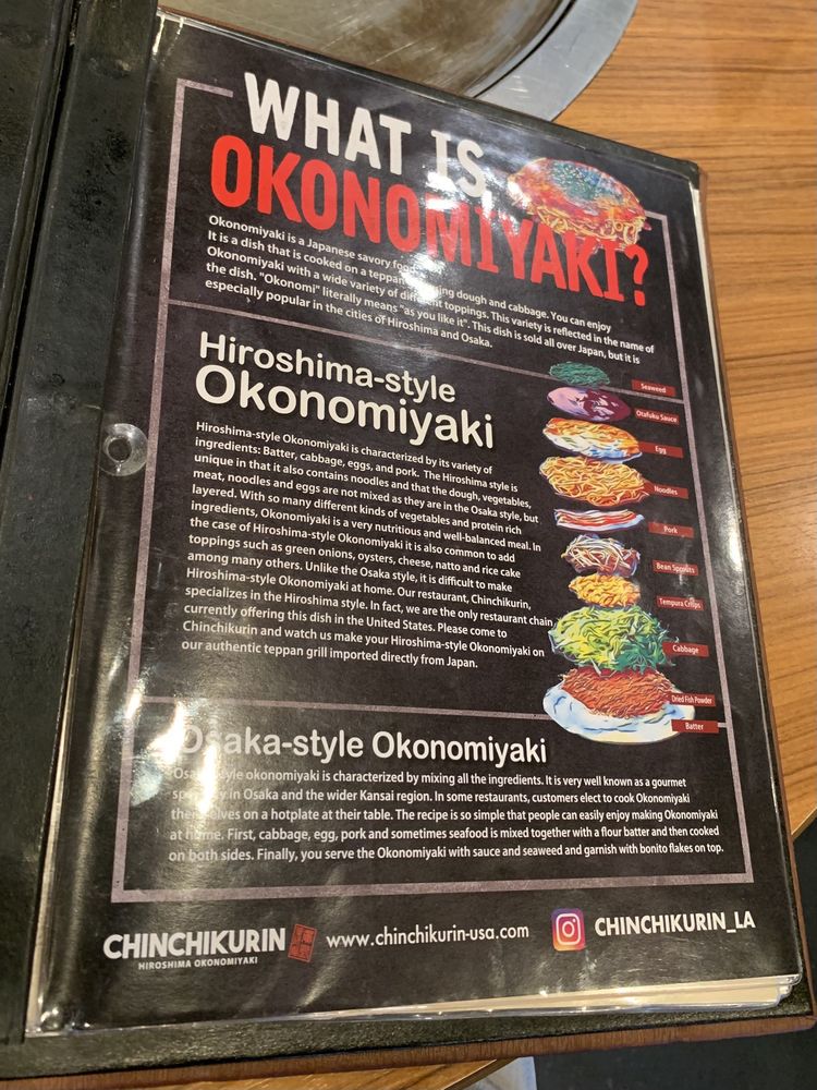 Beef. The signature dish of the Chinchikurin chain in Hiroshima. A local favorite, it does not have pork or beans sprouts. Instead, it has a ground beef mix known as "shibouriyaki" which adds a deeper depth of flavor and texture. if you're not sure which okonomiyaki dish to choose, order this 1!