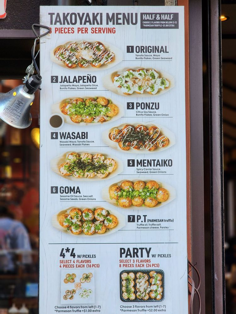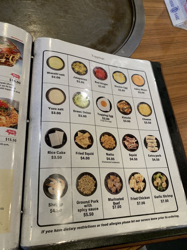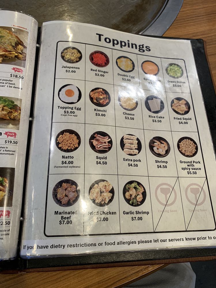 Pork. As 1 of the most favorite toppings (we even have a separate appetizer dish!) all of Japan, this dish is the classic topped with sauteed shrimp and broccoli, then drizzled with Japanese mayo.